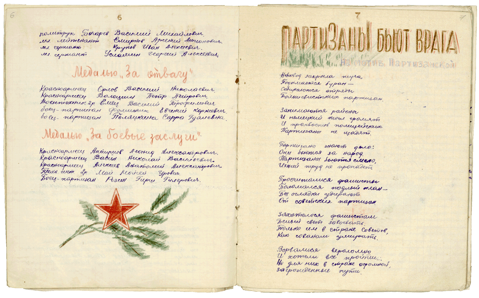 «...Более 30 километров, превозмогая усталость, гнали мы скот. Две ночи не спали, сутки не ели, прошли около 70 километров, но шли быстро, бодро, радуясь успеху. По пути разобрали два моста. 62 коровы по приказу командира отряда старшего политрука Покровского отдано семьям красноармейцев и партизан, тем, у кого немцы как у неблагонадежных изъяли скот».