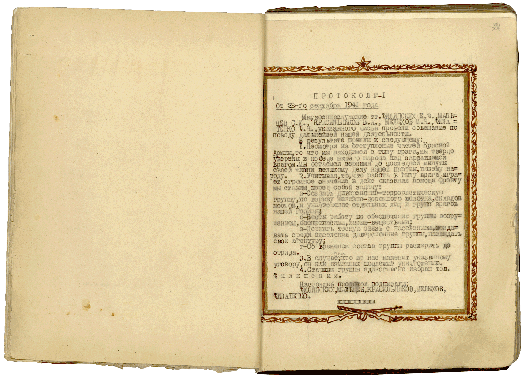 «...И вот в это время, время надвинувшейся осени 1941 года, в последних числах сентября месяца, в одном из районов временно оккупированной немцами Советской Белоруссии, среди глухих углов пуховичских лесных массивов горсточка отважных патриотов Родины официальной клятвой, официальной записью создала ядро будущей партизанской бригады«Пламя». Это была искорка, которой суждено было разгореться в пламя. Пять сталинских бесстрашных большевиков, пять преданных душой и телом воинов Советской Родины в составе: тт. Филипских Е.Ф., Мальцева С.И., Красильникова В.А., Мелехова М.Я. (погиб), Филатенко Ф.Я. и Колногорова Н.Ф., несмотря ни на какие коварно-хитрые происки врага, не считаясь ни с какими лишениями – ни с голодом, ни с холодом, пренебрегая опасностью вражеского тыла, проживая в таежных зарослях лесных кварталов, – решили, что они «твердо уверены в победе нашего народа над зарвавшимся врагом». Оторванные от своей родной Красной Армии, изолированные далеким фронтом от Советской Родины, мужественные патриоты не упали духом. Наоборот, чтобы поддержать веру в победу своего народа, они постановили: в случае, кто из них изменит указанному договору, как изменник Родины подлежит уничтожению».