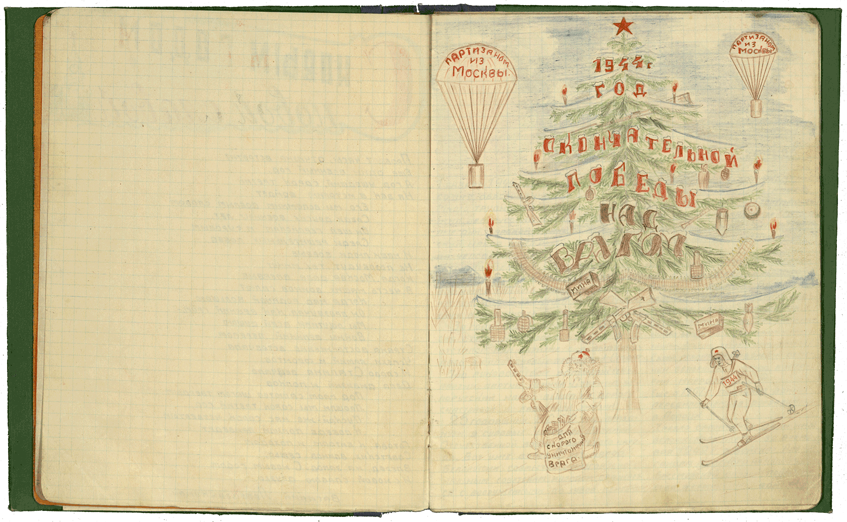 «В школе семейного лагеря, живущего под защитой партизан отряда, собрались ученики, пионеры и октябрята, чтобы встретить новый 1944 год. Посреди школы была установлена красиво убранная новогодняя ель. Комиссар отряда Федор Б. сделал доклад о 25-й годовщине БССР. После доклада была показана художественная самодеятельность школьников. На вечере ученики получили подарки от партизан, среди которых обувь, одежда, школьные принадлежности…»