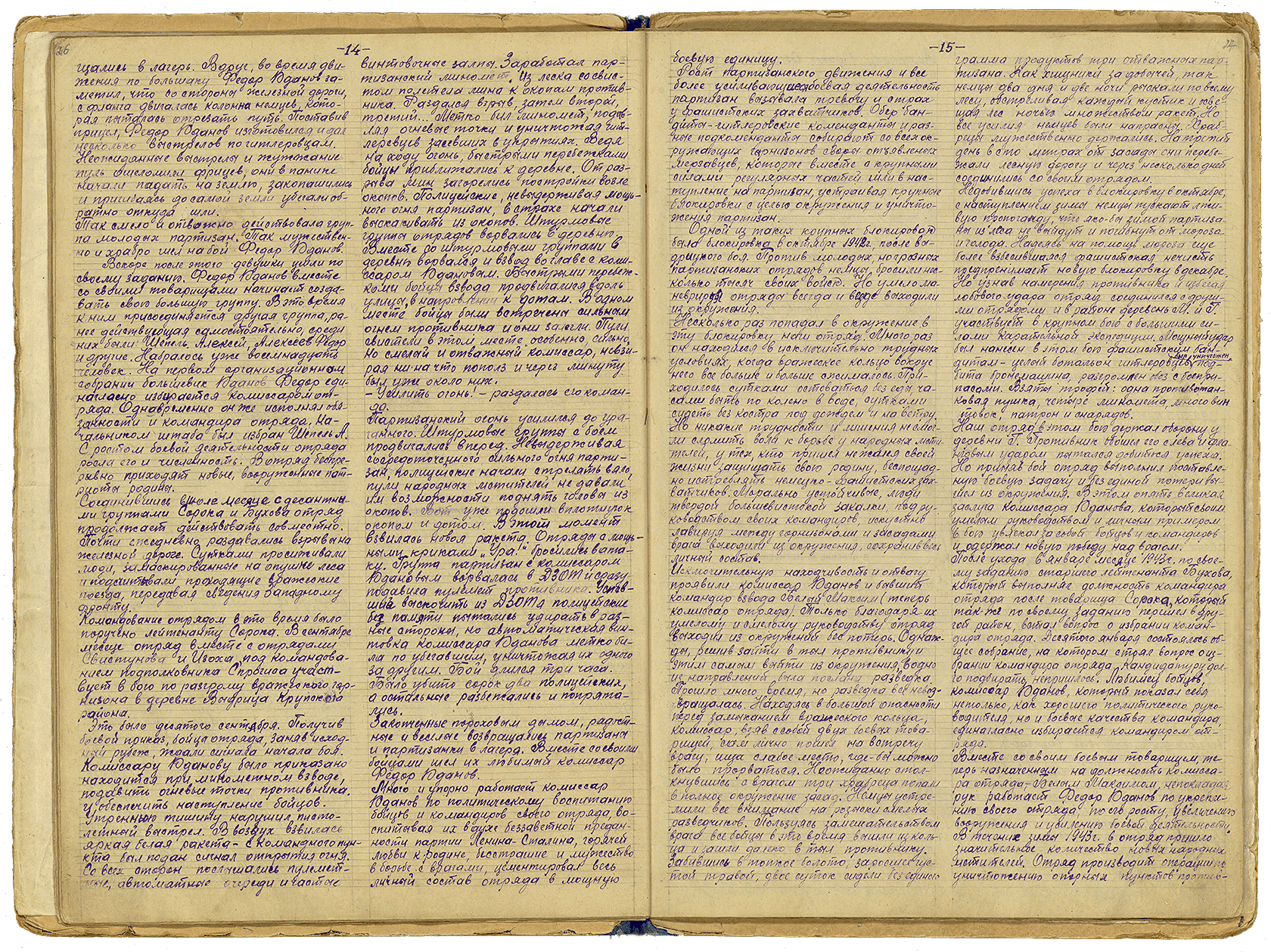 «Новую блокировку немцы планировали совершить в декабре. Отряд соединяется с другими отрядами и участвует в крупном бою с большими силами карательной экспедиции. Наш отряд в этом бою держал оборону у деревни Г. Приняв бой, без единой потери вышли из окружения. В этом опять великая заслуга комиссара Юданова, который умелым руководством и своим личным примером в бою увлекал за собой бойцов и командиров».
