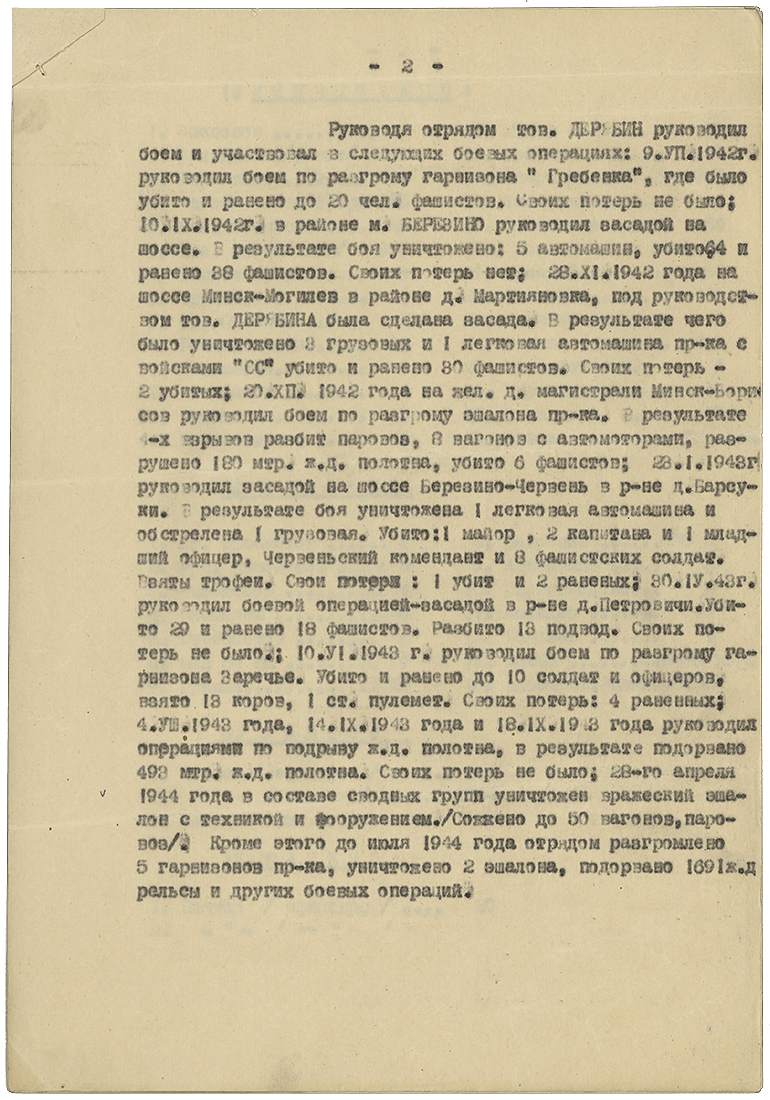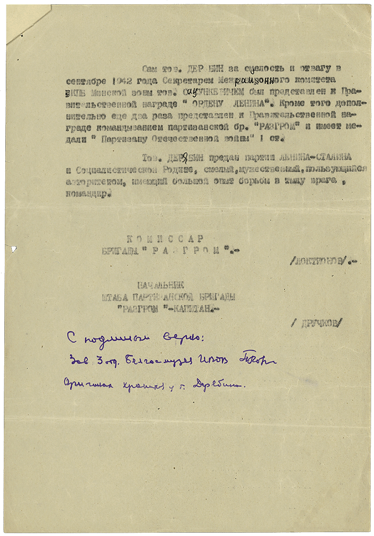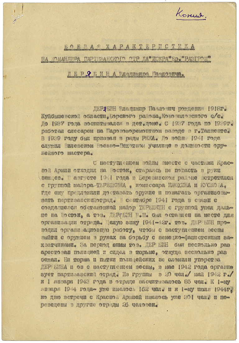 Из боевой характеристики командира партизанского отряда «Искра» бригады «Разгром» Владимира Дерябина