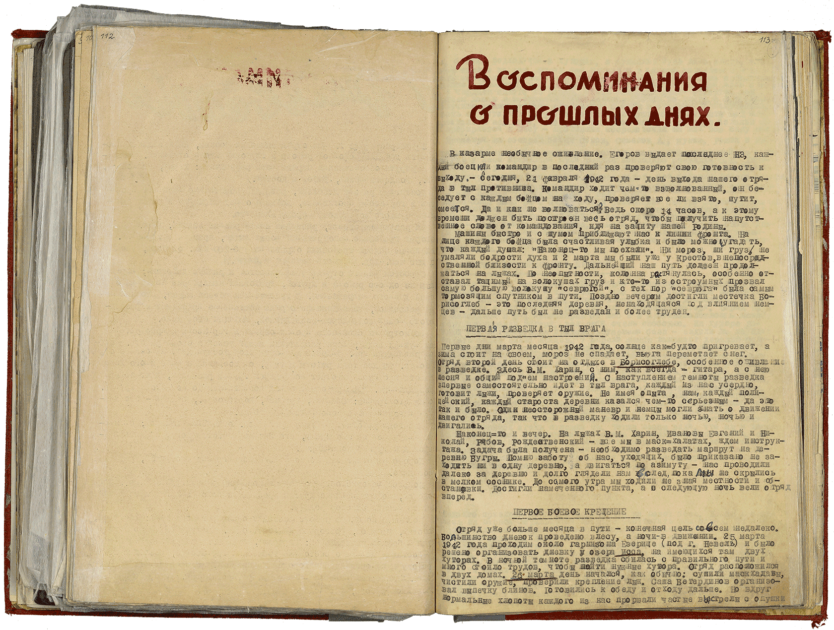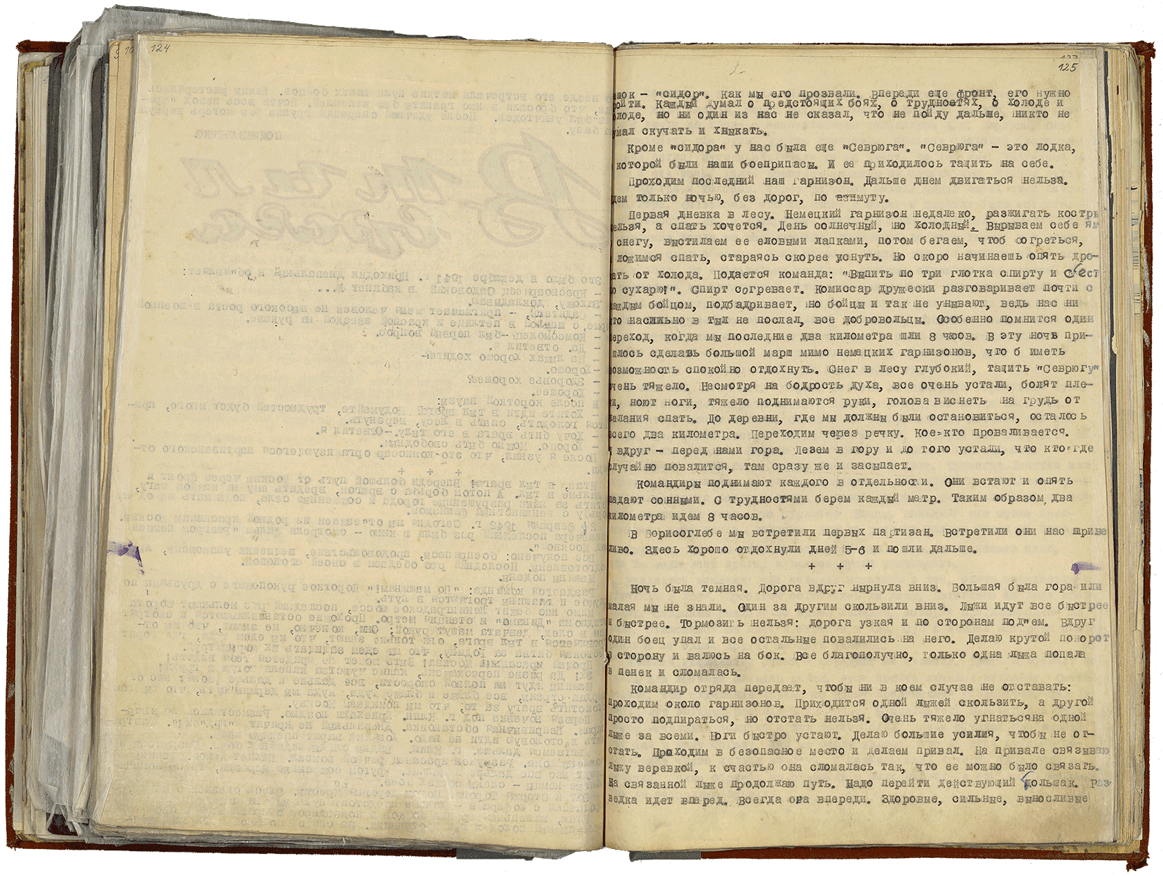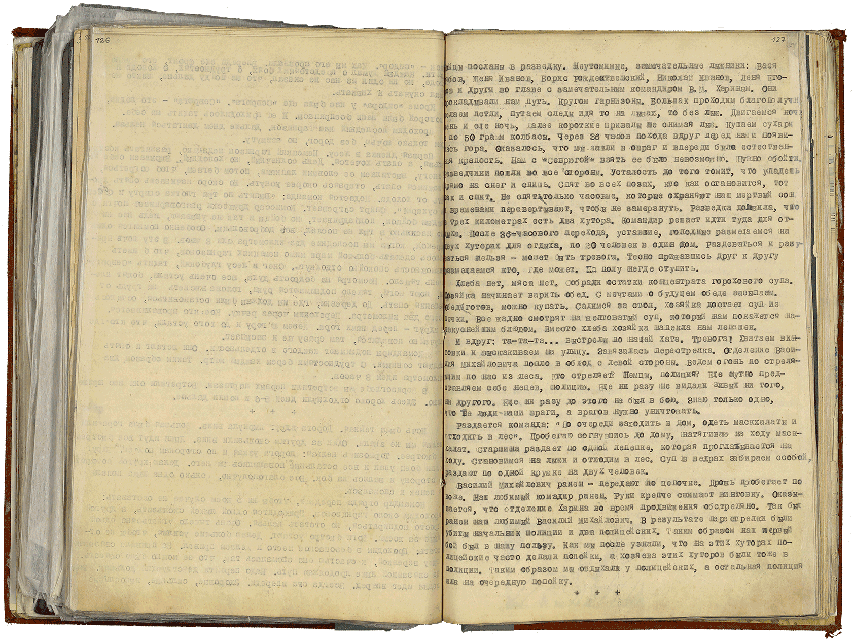 «Днёвка в лесу. Немецкий гарнизон недалеко, разжигать костры нельзя. Вырываем себе яму в снегу, выстилаем ее еловыми лапками, потом бегаем, чтобы согреться, и ложимся спать. Но скоро начинаешь опять дрожать от холода. Подается команда: «Выпить по три глотка спирту и съесть по сухарю. Комиссар подбадривает бойцов… Делаем петли, путаем следы, идя то на лыжах, то без них. Двигаемся ночь, день, ещё ночь. Далее короткие привалы не снимая лыж. Кушаем сухари и по 50 грамм колбасы. Усталость до того томит, что упадешь прямо на снег и спишь, спят во всех позах, кто как остановится. Не спят только часовые».