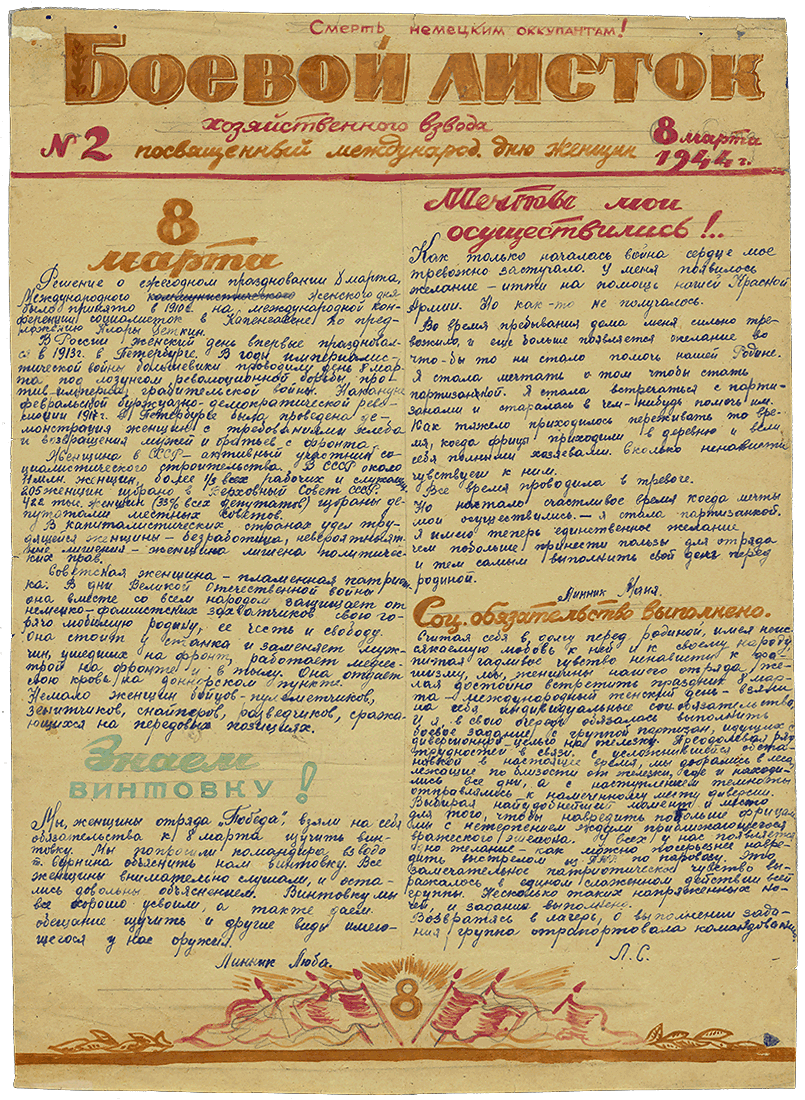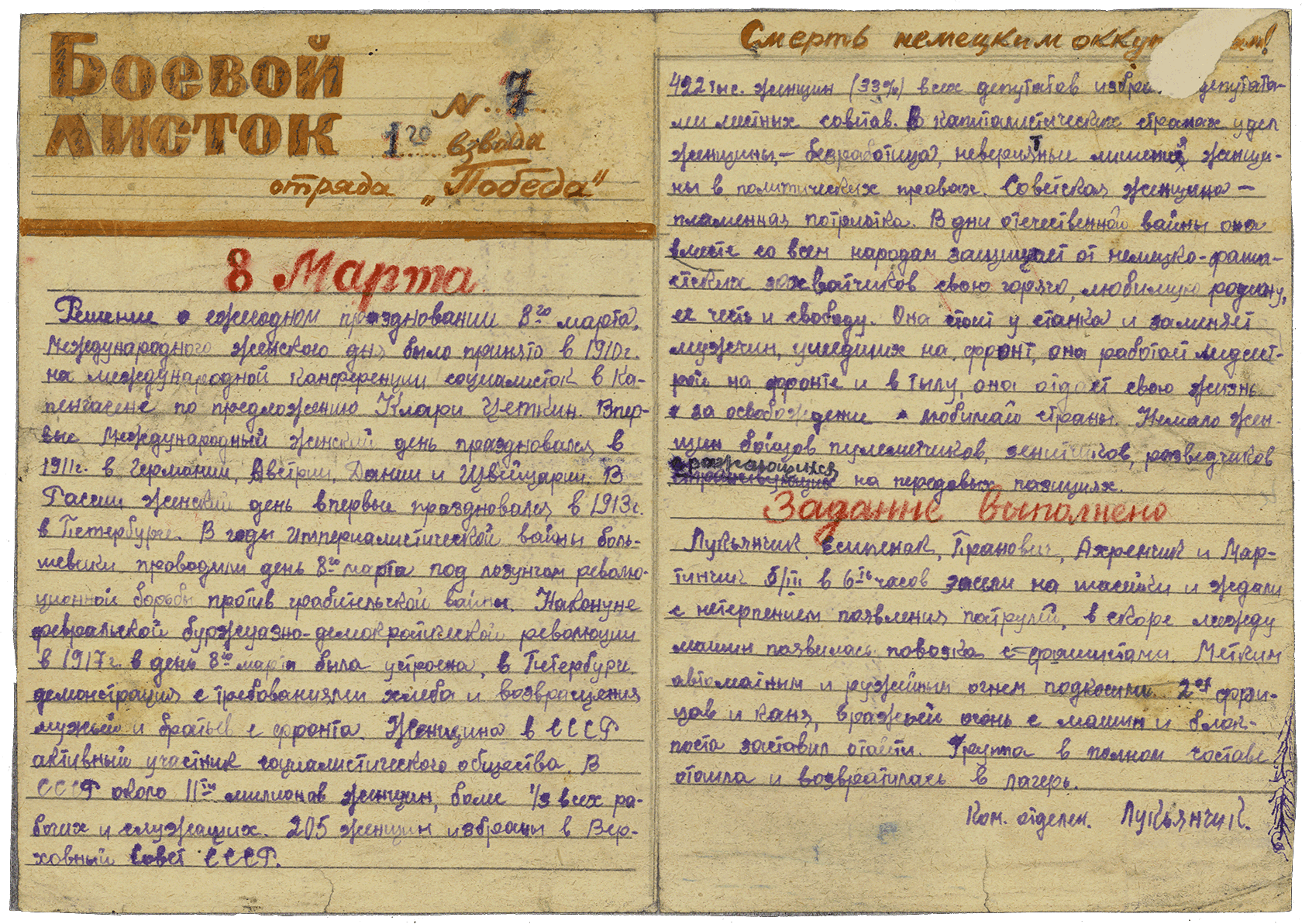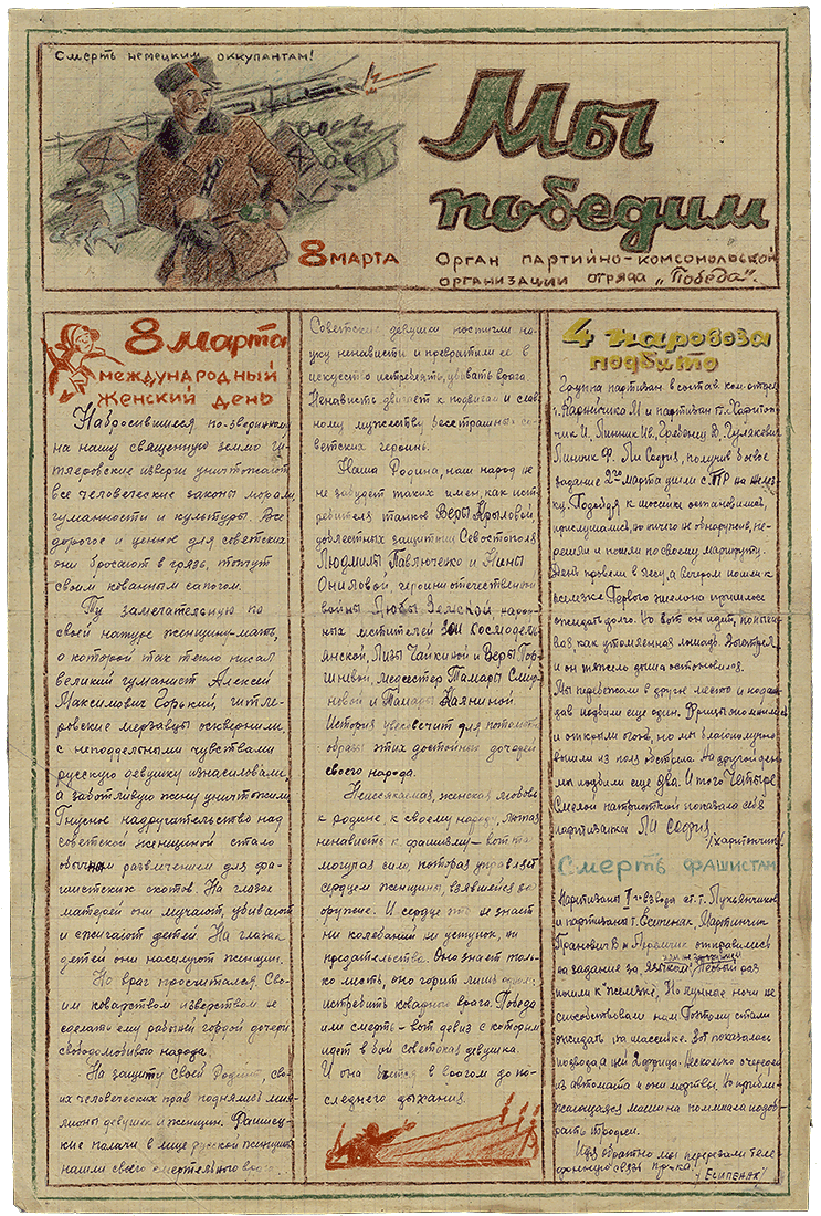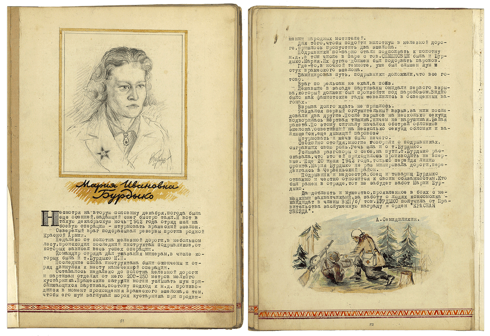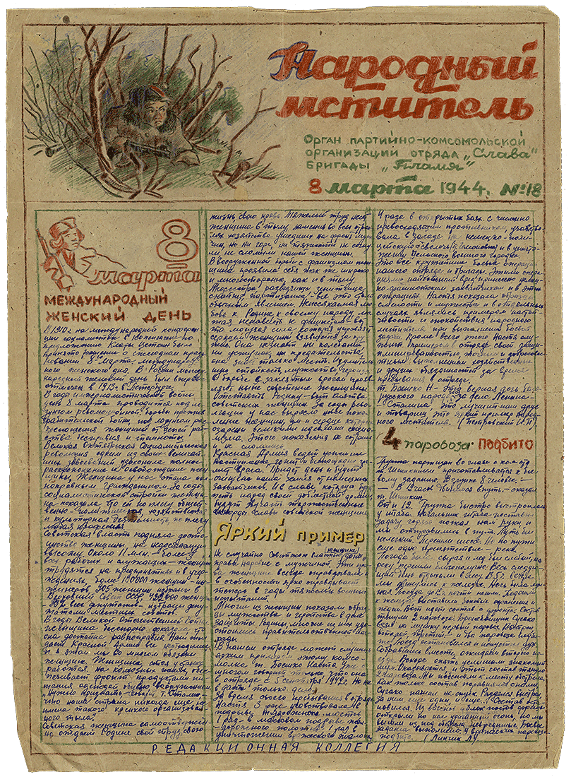 Рукописные партизанские журналы хранили с важными документами и старательно наполняли фактами вместе с рассказами о быте, сражениях, героях. Самодельные «книги» оживляли рисунками и неизменным юмором. Передавая из рук в руки, их читали для поднятия духа с надеждой на скорую победу.
