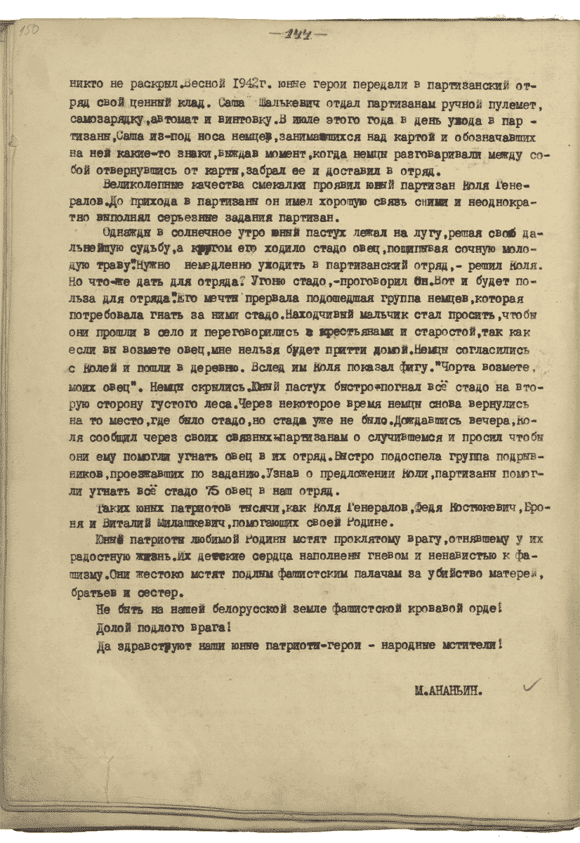 Очерки и рассказы о юных героях, написанные талантливыми журналистами-партизанами Ананьиным и Деевым, сохранились в рукописных журналах отрядов имени И.В.Сталина Могилевской области и 3-й Минской партизанской бригады имени С.М.Буденного.
