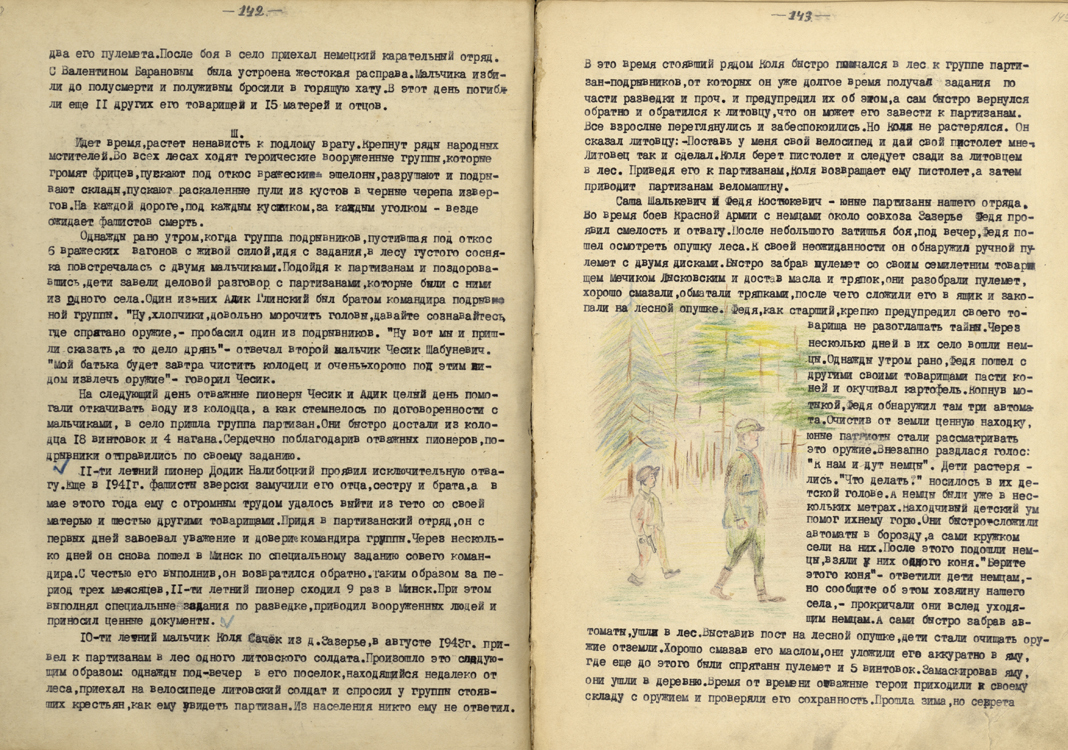 Подростков, чьи родители погибли в фашистских застенках, командование было вынуждено брать в партизанские отряды. В некоторых формированиях открывали школы, чтобы ребята продолжали учебу. Дети становились невольными свидетелями тяжелой жизни партизан: провожали бойцов на боевые задания, видели страдания раненых, прощались с погибшими. Все это запечатлено в рукописных газетах пионерских отрядов при лесных школах.