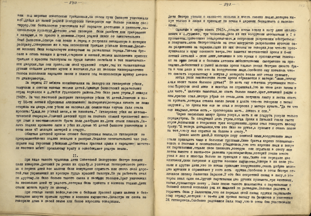 «В школе на траурном митинге мы узнали, что нашу бригаду посетило большое несчастье. От руки фашистских палачей погибли 20 партизан. Мы, ученики нашей школы, поклялись жестоко отомстить за смерть наших братьев. С каждым днем у нас увеличивается количество отличников...»