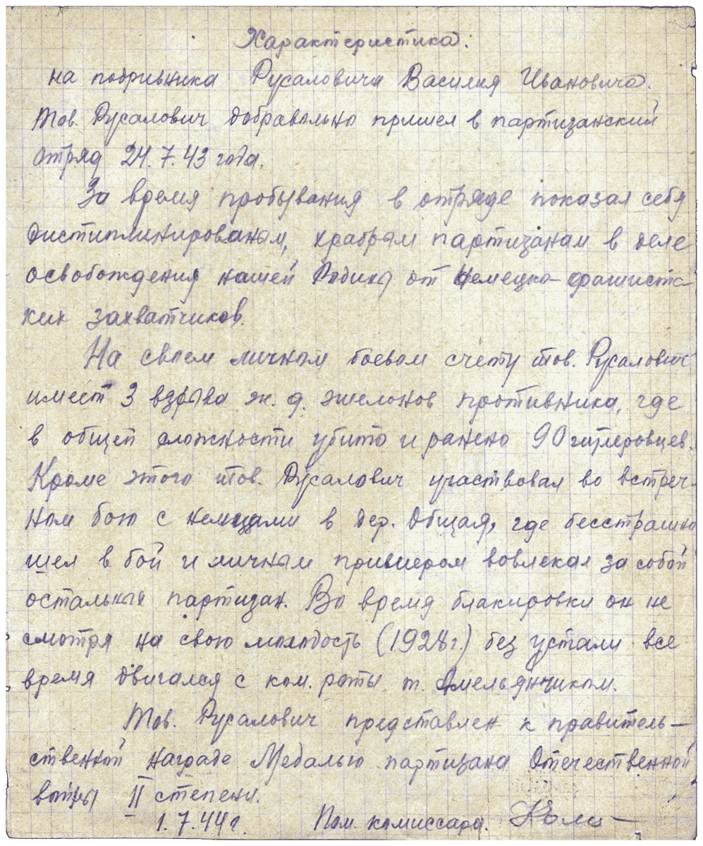 «На своем личном боевом счету тов. Русалович имеет три взрыва ж.д. эшелонов противника, где в общей сложности убито и ранено 90 гитлеровцев. Кроме этого тов. Русалович участвовал во встречном бою с немцами в дер. Общая, где бесстрашно шел в бой и личным примером вовлекал за собой остальных партизан. Во время блокировки он, несмотря на свою молодость (1928 г.р.), без устали все время двигался с командиром роты тов. Амельянчиком».