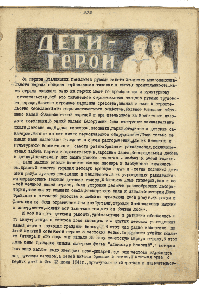 Вместе со взрослыми они делили все трудности войны и партизанского быта, они расклеивали листовки, были связными и разведчиками, ходили на боевые операции. Более пяти с половиной тысяч юных патриотов стали участниками подпольного и партизанского движения в годы Великой Отечественной в Беларуси. Двое из них – Марат Казей и Зина Портнова – удостоены звания Героя Советского Союза посмертно.