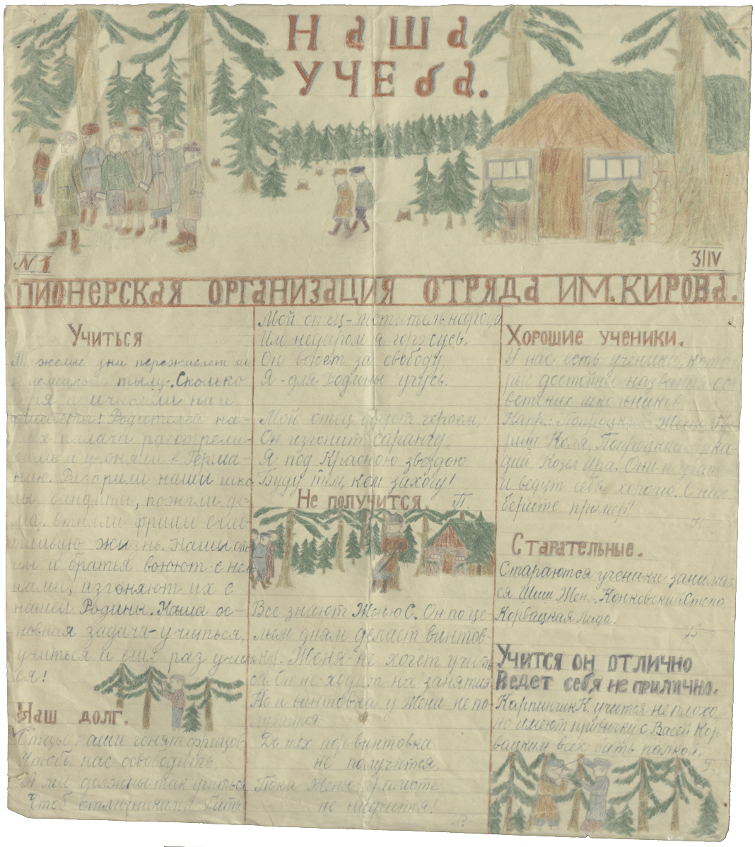 Фрагмент статьи стенной газеты №1 «Наша учеба» пионерской организации имени Кирова, Брестская область, 1944 год