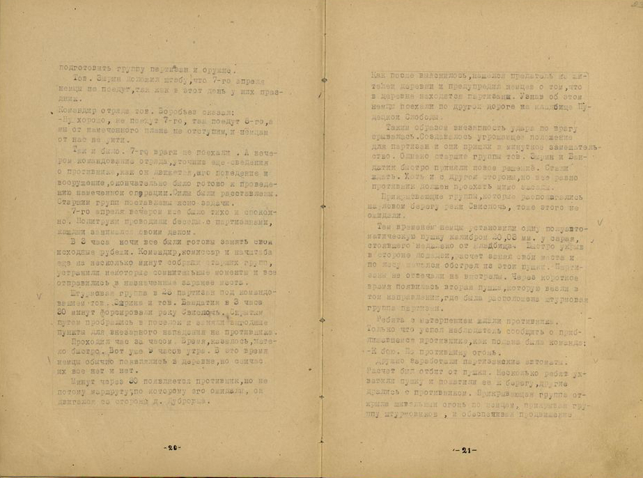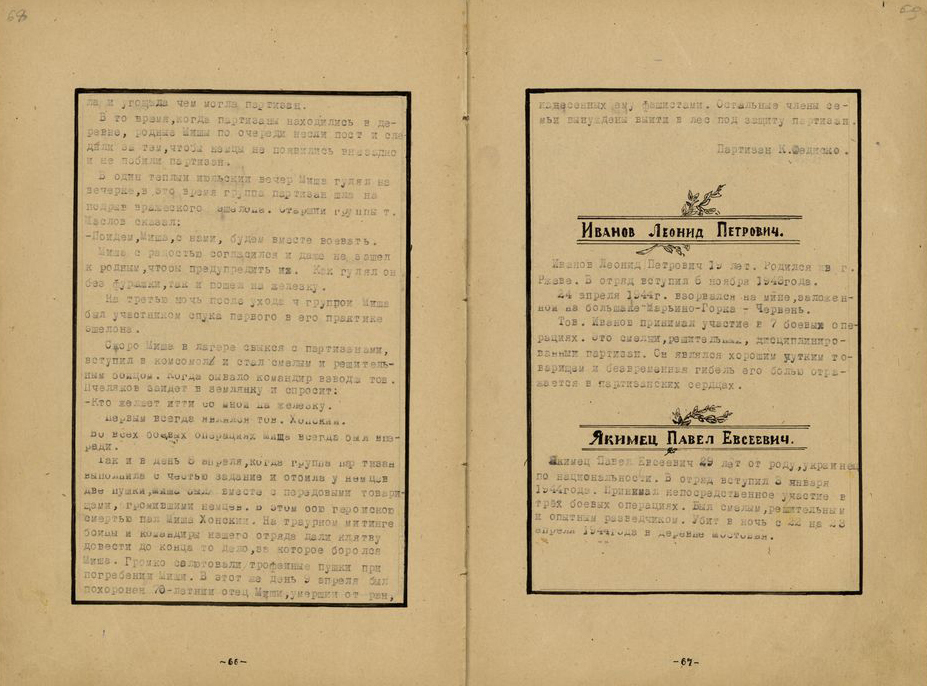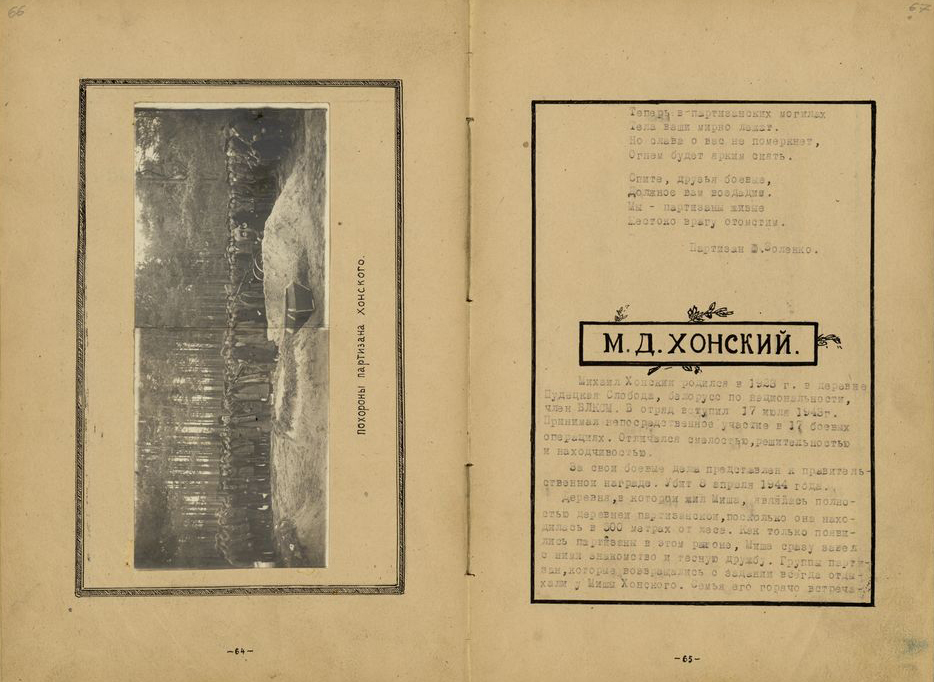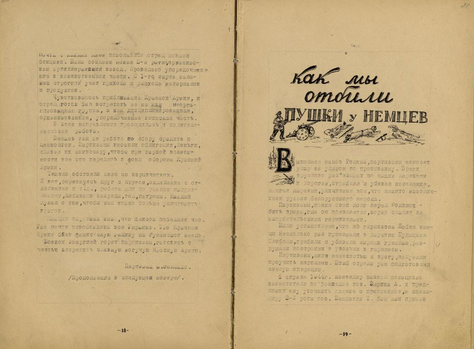 Рукописные партизанские журналы хранили с важными документами и старательно наполняли фактами вместе с рассказами о быте, сражениях, героях. Самодельные «книги» оживляли рисунками и неизменным юмором. Передавая из рук в руки, их читали для поднятия духа с надеждой на скорую победу.