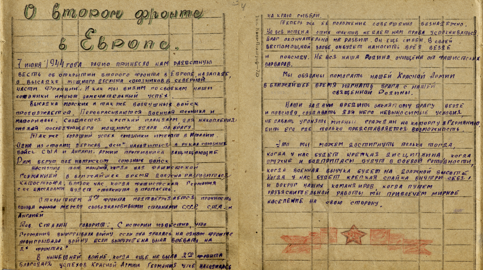 «7 июня 1944 года радио принесло нам радостную весть об открытии второго фронта в Европе, на западе, о высадке мощного десанта союзников в северной части Франции. Высадка морских и также воздушных войск продолжается. Перебрасываются военная техника и материалы. Создается крепкий плацдарм для последующего мощного удара по врагу».