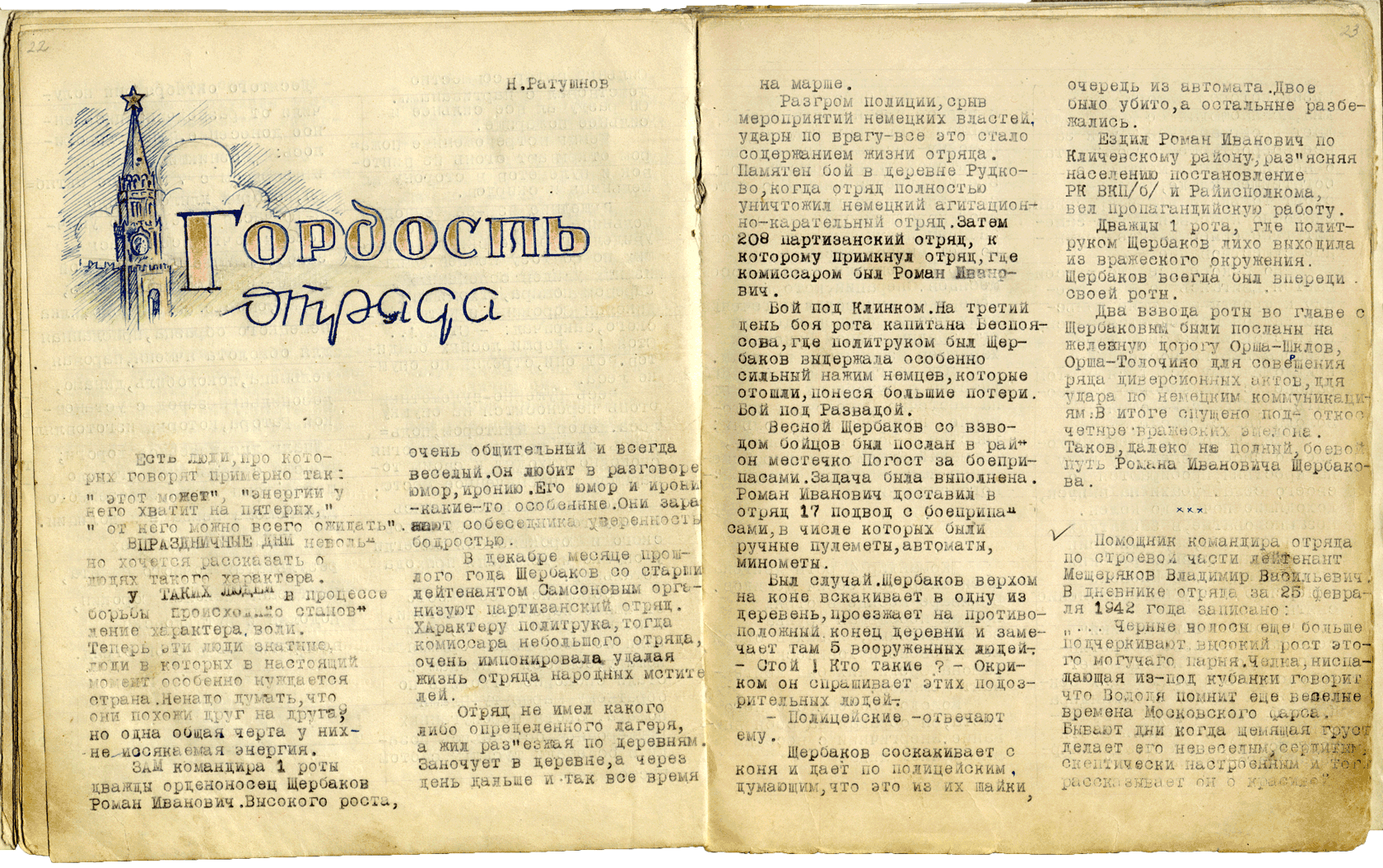 «Ёсць людзі, пра якіх гавораць прыкладна так: «гэты можа», «энергіі ў яго хопіць на пяцярых», «ад яго можна ўсяго чакаць». У святочныя дні міжвольна хочацца расказаць пра людзей такога характару», – гісторыі пра вопытных камандзіраў у часопісе пераплятаюцца з гісторыямі пра простых байцоў, часта – юнакоў, якія рана пасталелі, як, напрыклад, Міхаіл Буйніцкі. Зусім яшчэ хлопчык, ён разагнаў групу паліцэйскіх. У хуткім часе Міша звязаўся з партызанскім атрадам, які прыняў яго ў свае рады.