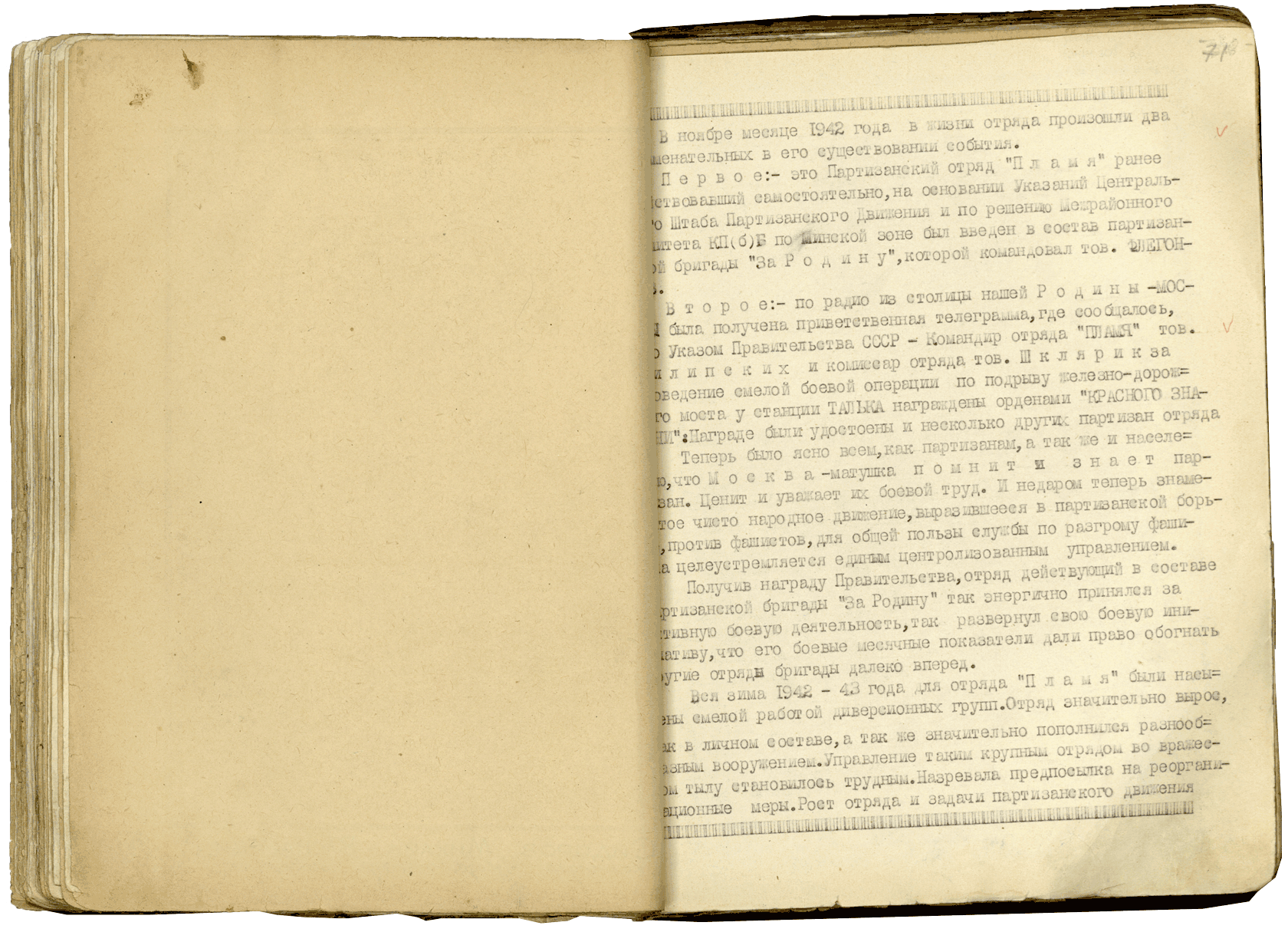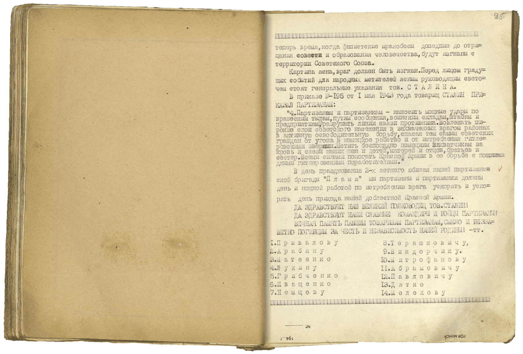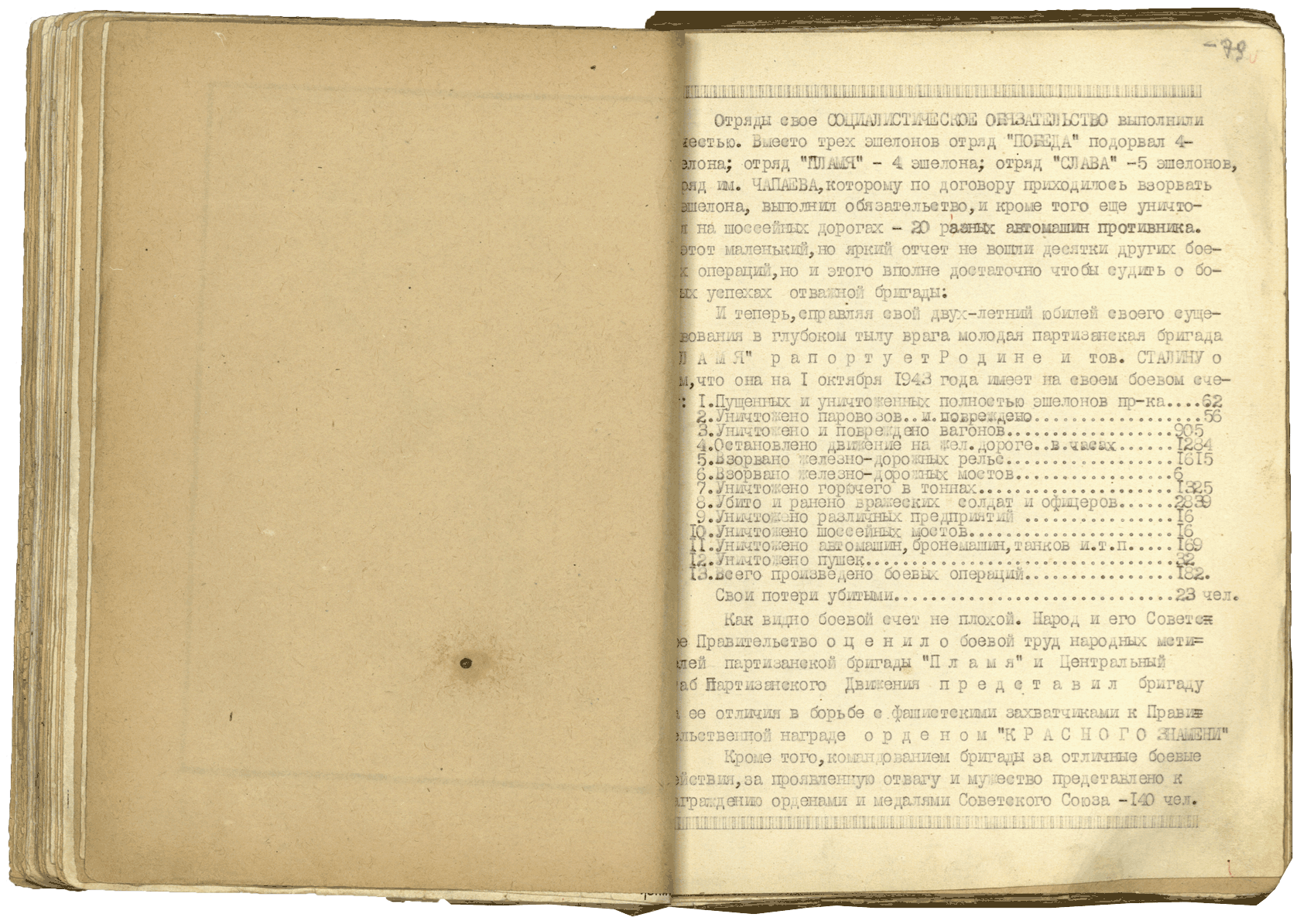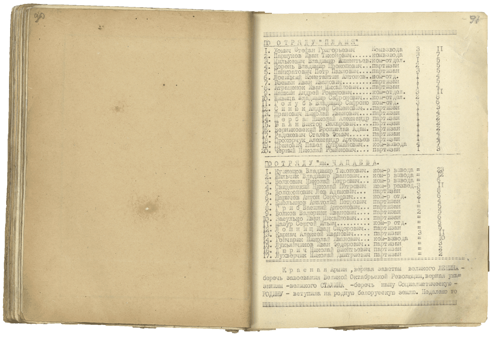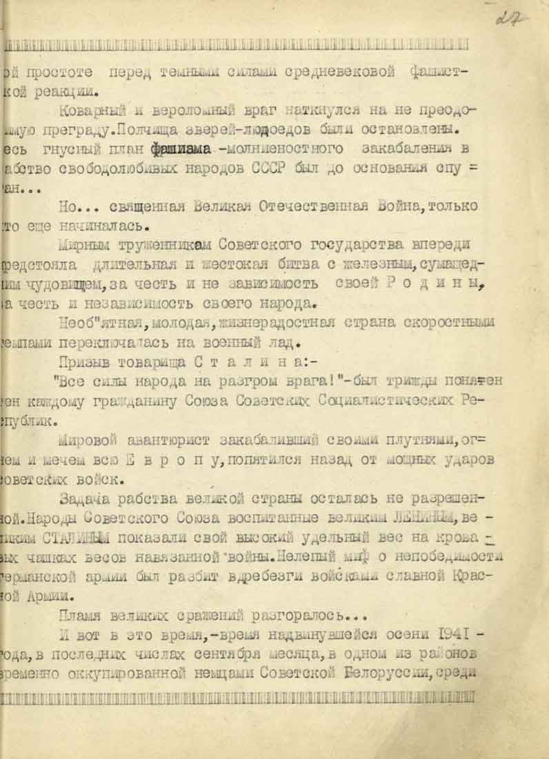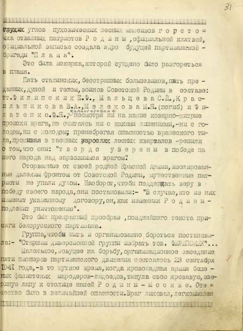 «...І вось у гэты час, час надышоўшай восені 1941 года, у апошніх чыслах верасня месяца, у адным з раёнаў часова акупіраванай немцамі Савецкай Беларусі, сярод глухіх гушчароў пухавіцкіх лясных масіваў жменька адважных патрыётаў Радзімы афіцыйнай клятвай, афіцыйным запісам стварыла ядро будучай партызанскай брыгады «Полымя». Гэта была іскрынка, якой наканавана было разгарэцца ў полымя. Пяць сталінскіх бясстрашных бальшавікоў, пяць адданых душой і целам воінаў Савецкай Радзімы ў складзе: тт. Філіпскіх Я.Ф., Мальцава С.І., Красільнікава В.А., Мелехава М.Я. (загінуў), Філаценкі Ф.Я. і Калнагорава М.Ф., нягледзячы ні на якія каварна-хітрыя прыёмы ворага, ні на якія нягоды – ні на голад, ні на холад, пагарджаючы небяспекай варожага тылу, пражываючы ў таежных зарасніках лясных кварталаў, – вырашылі, што яны «цвёрда ўпэўнены ў перамозе нашага народа над нахабным ворагам». Адарваныя ад сваёй роднай Чырвонай Арміі, ізаляваныя далёкім фронтам ад Савецкай Радзімы, мужныя патрыёты не ўпалі духам. Наадварот, каб падтрымаць веру ў перамогу свайго народа, яны пастанавілі: у выпадку, хто з іх здрадзіць указанаму дагавору, як здраднік Радзімы падлягае знішчэнню».