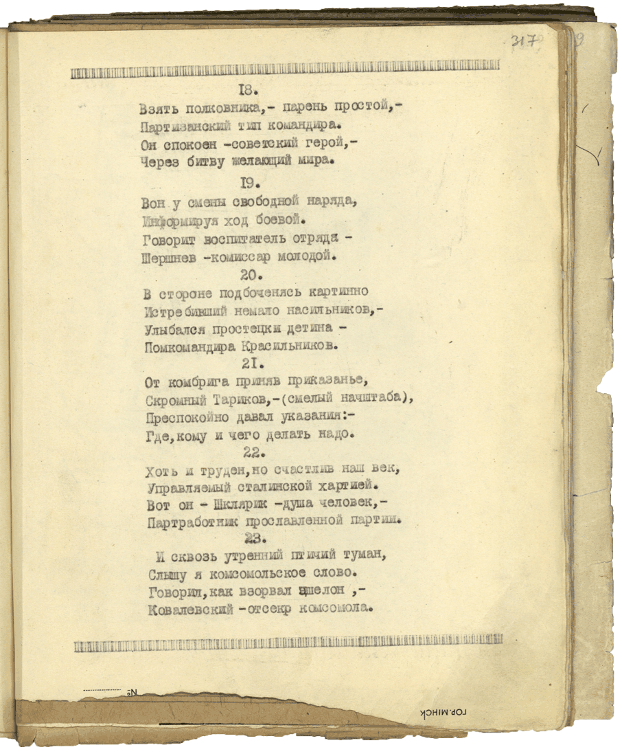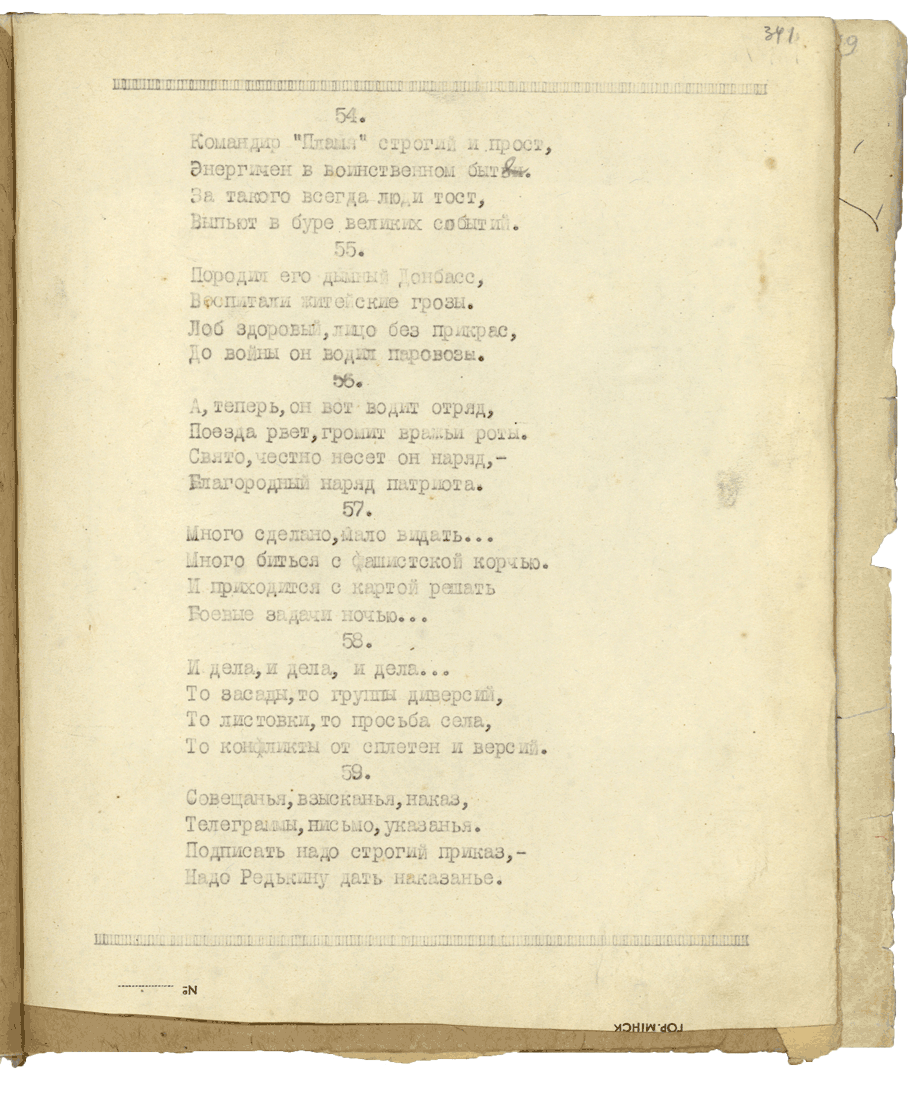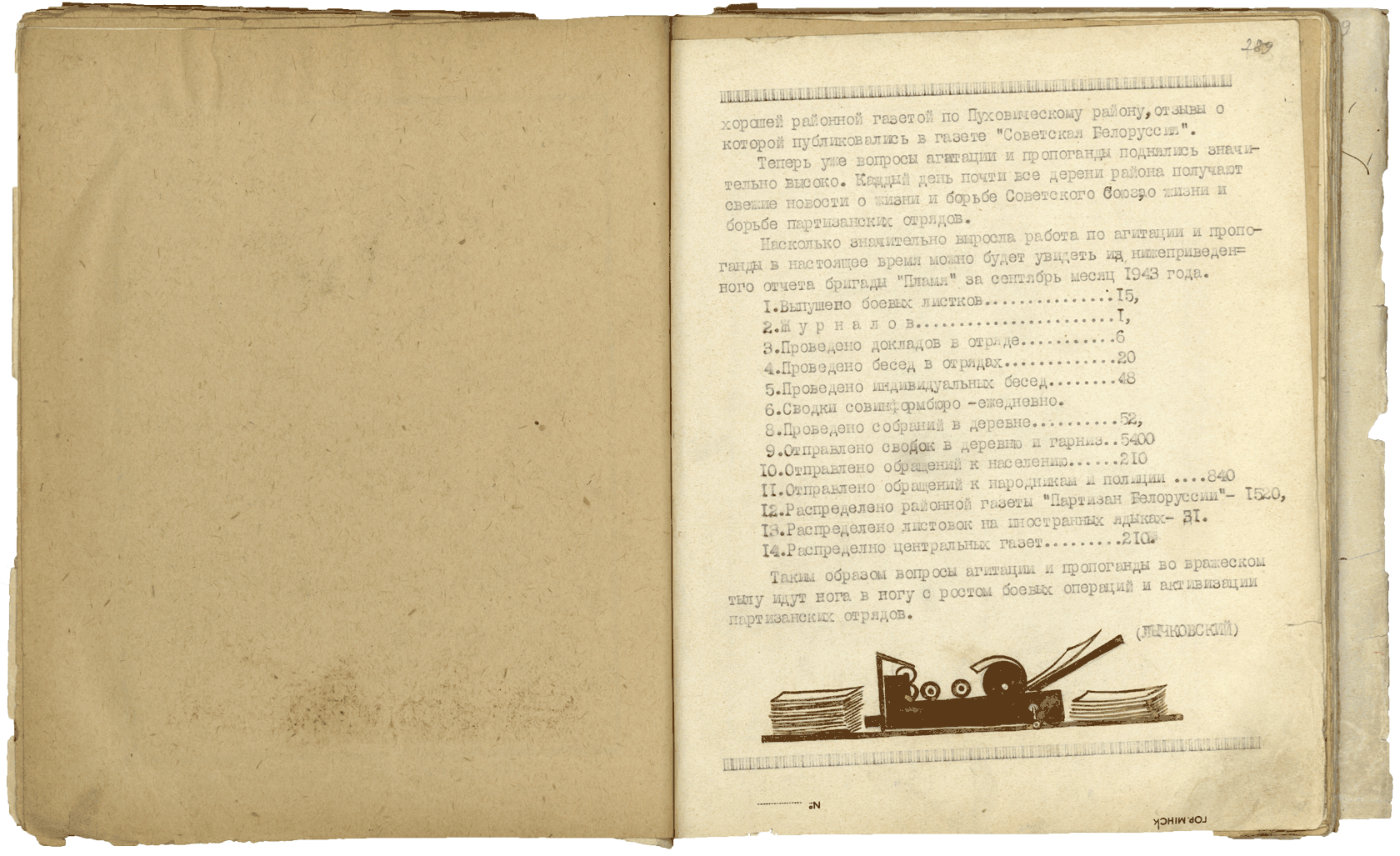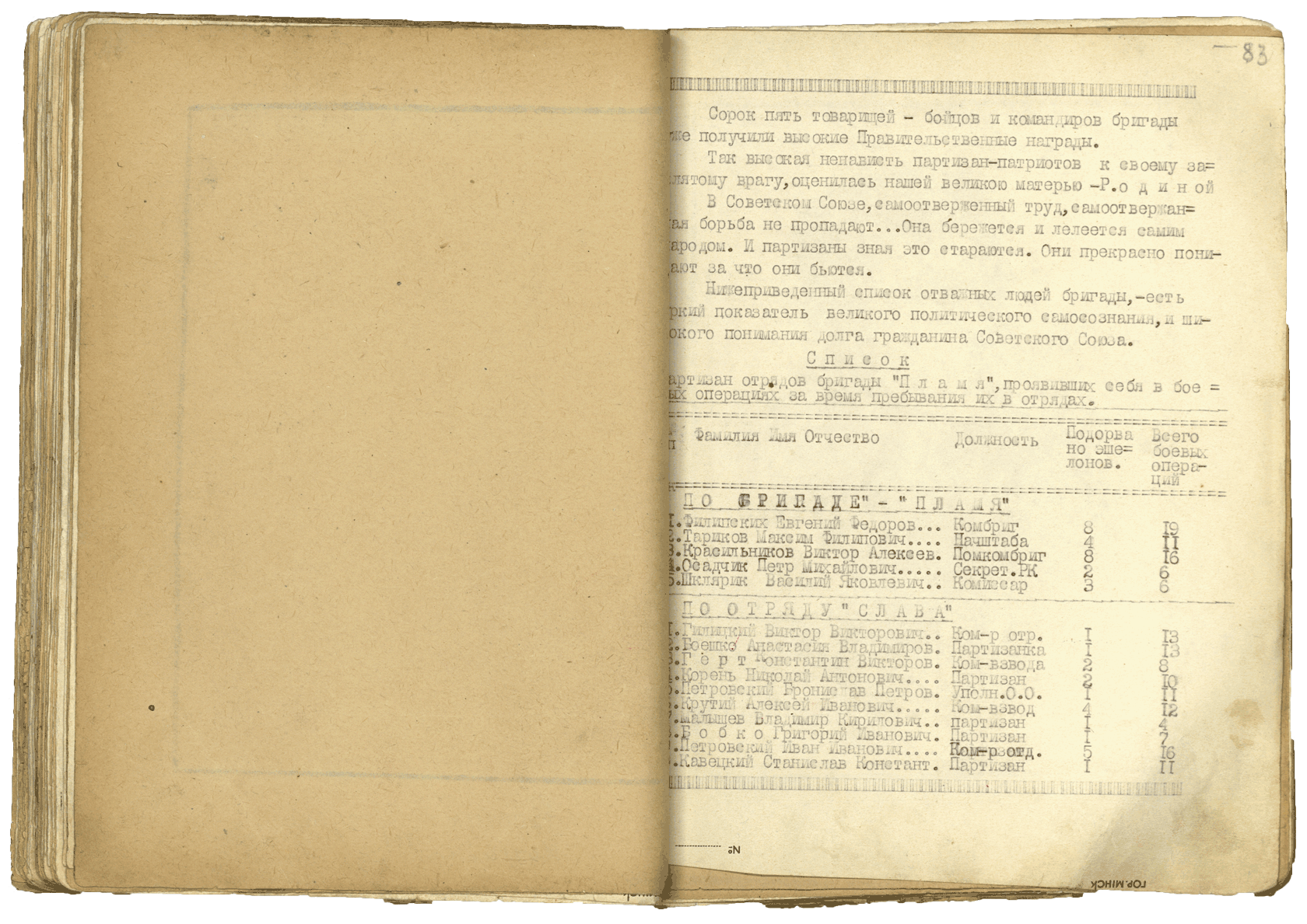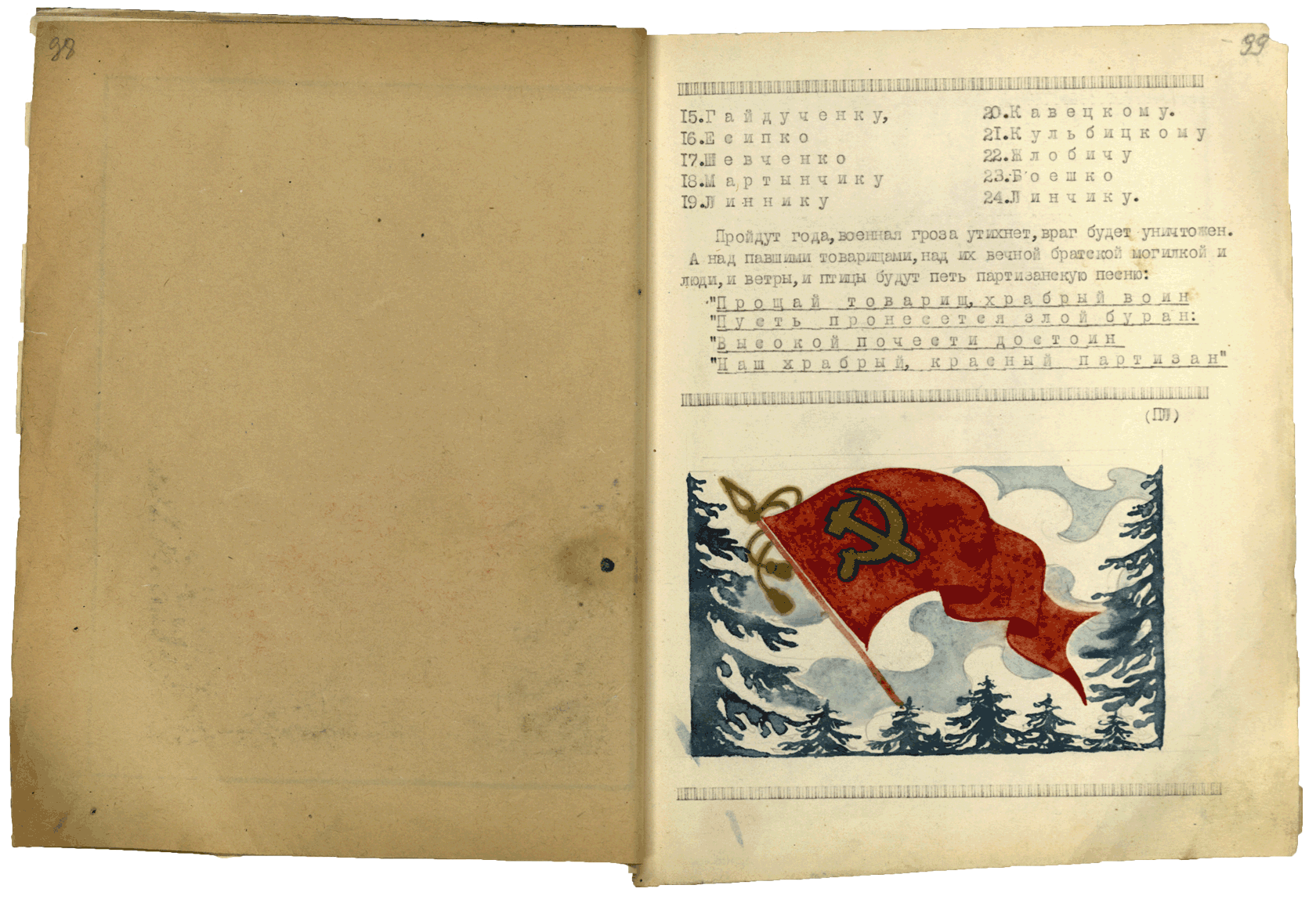 «...І вось у гэты час, час надышоўшай восені 1941 года, у апошніх чыслах верасня месяца, у адным з раёнаў часова акупіраванай немцамі Савецкай Беларусі, сярод глухіх гушчароў пухавіцкіх лясных масіваў жменька адважных патрыётаў Радзімы афіцыйнай клятвай, афіцыйным запісам стварыла ядро будучай партызанскай брыгады «Полымя». Гэта была іскрынка, якой наканавана было разгарэцца ў полымя. Пяць сталінскіх бясстрашных бальшавікоў, пяць адданых душой і целам воінаў Савецкай Радзімы ў складзе: тт. Філіпскіх Я.Ф., Мальцава С.І., Красільнікава В.А., Мелехава М.Я. (загінуў), Філаценкі Ф.Я. і Калнагорава М.Ф., нягледзячы ні на якія каварна-хітрыя прыёмы ворага, ні на якія нягоды – ні на голад, ні на холад, пагарджаючы небяспекай варожага тылу, пражываючы ў таежных зарасніках лясных кварталаў, – вырашылі, што яны «цвёрда ўпэўнены ў перамозе нашага народа над нахабным ворагам». Адарваныя ад сваёй роднай Чырвонай Арміі, ізаляваныя далёкім фронтам ад Савецкай Радзімы, мужныя патрыёты не ўпалі духам. Наадварот, каб падтрымаць веру ў перамогу свайго народа, яны пастанавілі: у выпадку, хто з іх здрадзіць указанаму дагавору, як здраднік Радзімы падлягае знішчэнню».