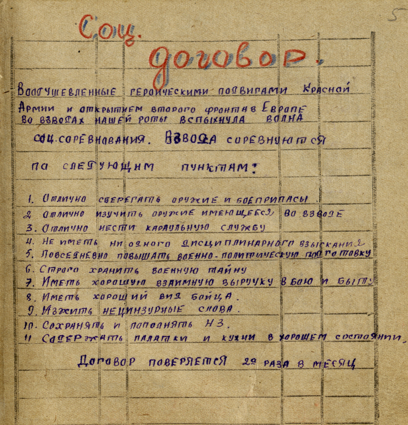 Натхнёныя поспехамі Чырвонай Арміі і адкрыццём другога фронту ў Еўропе байцы партызанскіх фарміраванняў пачалі праводзіць сацспаборніцтвы. У пунктах іх праходжання значылася: выдатна зберагаць зброю і боепрыпасы, не мець ніводнага дысцыплінарнага спагнання, выкараніць нецэнзурныя словы, захоўваць палаткі і кухні ў добрым выглядзе, штодзённа павышаць ваенна-палітычную падрыхтоўку.