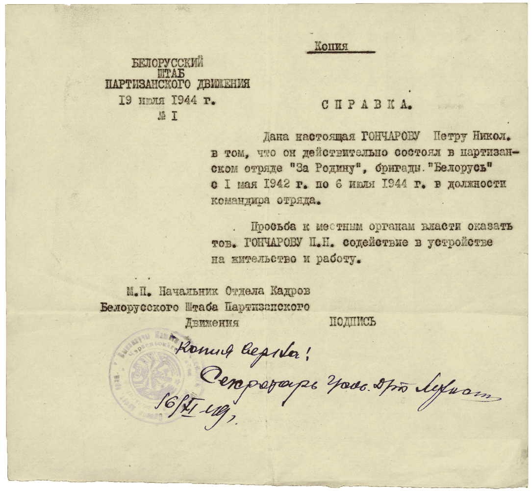 白罗斯游击运动参谋部向冈察洛夫颁发的证明书