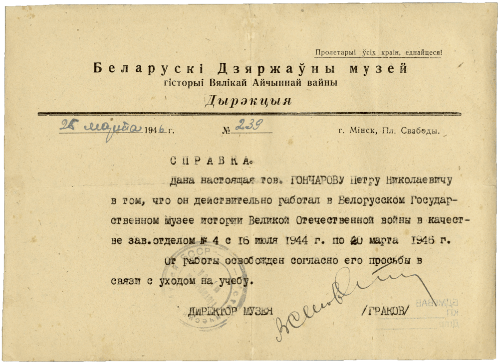 该证明书说明冈察洛夫从1944年7月16日至1946年3月20日担任博物馆的工作人员