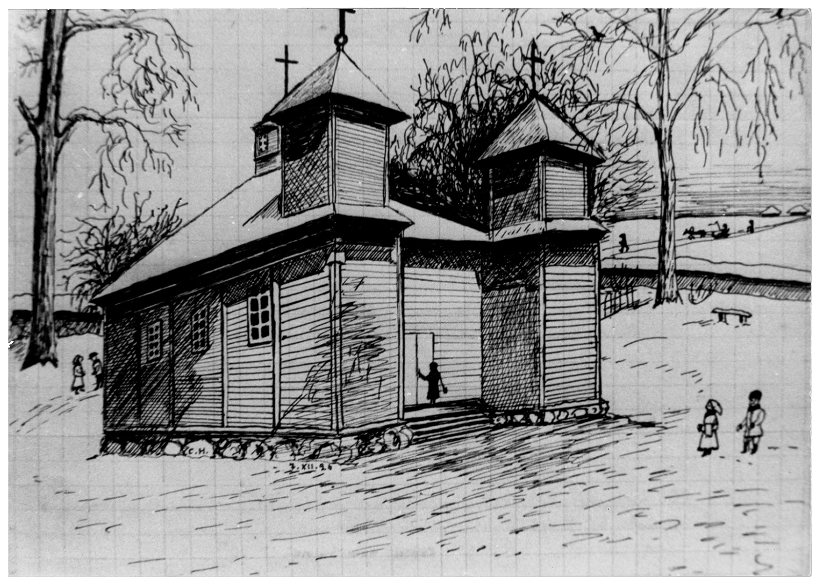 Zeichnung einer Kirche im Dorf Bljatschin (heute Dorf Sadowaja) im Kreis Klezk