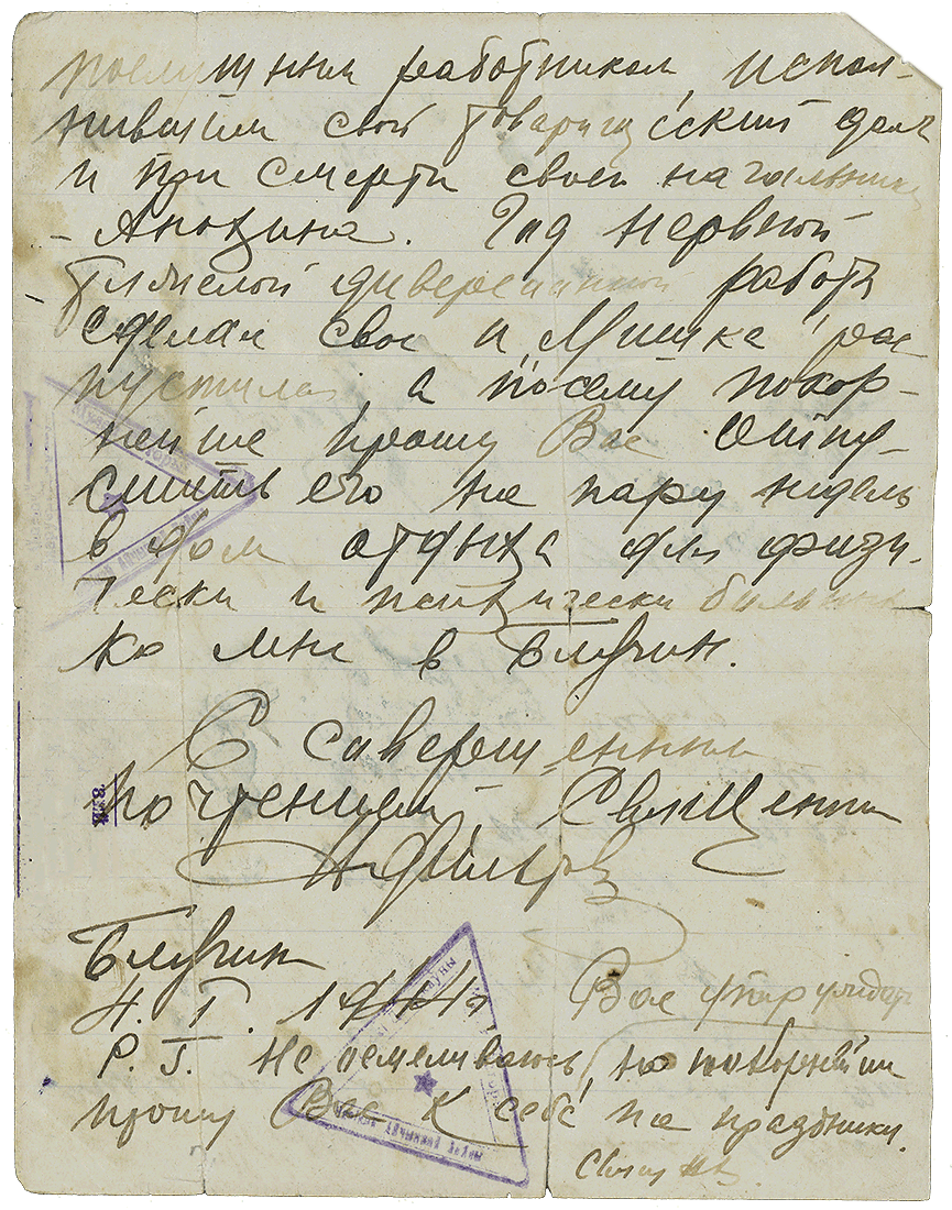 Dieser Brief war adressiert an den Kommandeur der 300. Woroschilow-Partisanenbrigade Wassili Jeremenko. Der Priester Nikolai Chiltow gratulierte ihm zum christlichen Fest und bat ihn zugleich darum, den verwundeten Michail Scherschnew, der den Tod seines Kommandeurs Anochin schwer nahm, in das „Erholungsheim" zu schicken. Der Priester hat vorhin für den verstorbenen Anochin ein Totenamt gehalten.
