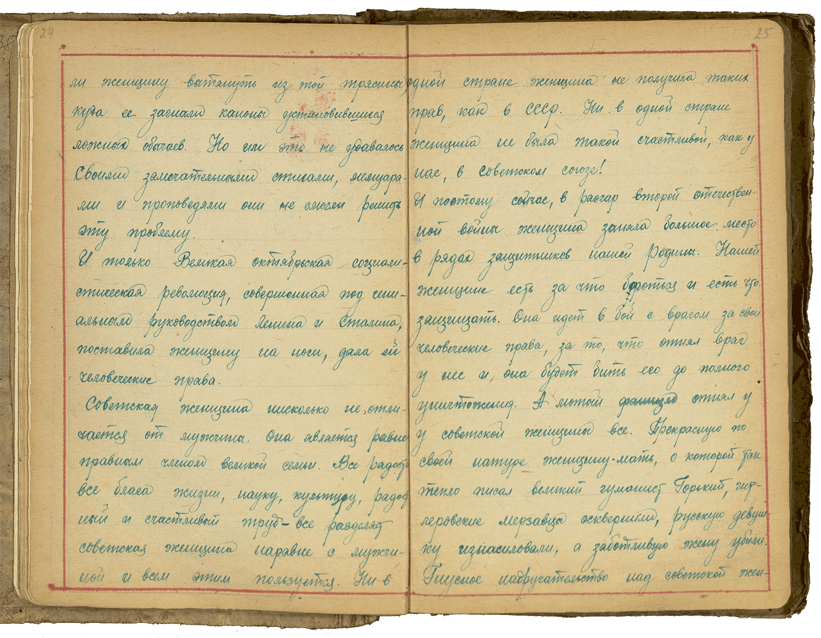 „Die sowjetische Frau kämpft Schulter an Schulter und auf gleicher Augenhöhe mit dem Mann gegen faschistische Eroberer, sie treibt sie weg von unserem heiligen Boden. Panzerfahrerin, Fliegerin, Schütze, Kommandeurin, Partisanin – so lernte der Feind die sowjetische Mutter, Ehefrau und Geliebte kennen..."
