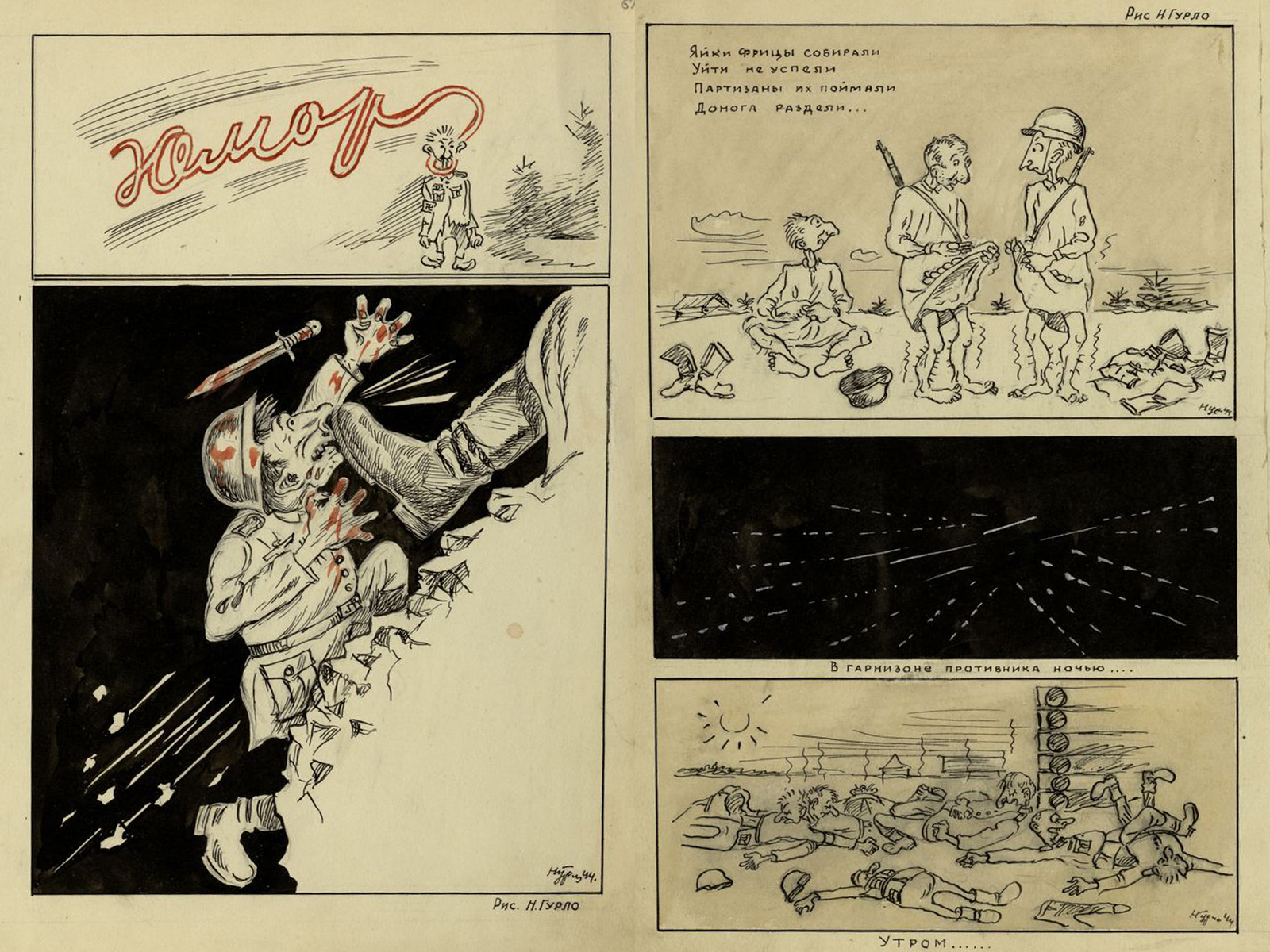 "Andorreando por los rescoldos Gurló juró nunca perdonar, juró vengar a los fascistas. Como uno de muchos patriotas soviéticos desde los primeros días de la guerra empezó la lucha contra el fascismo". En la revista nº1 "Partizánskaya borbá" del destacamento M.I.Kalinin de la brigada del periódico "Pravda" fechada con octubre de 1943 empieza la biografía de combate del pintor bielorruso y participante de la Gran Guerra Patria Nikolái Gurló.