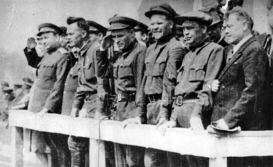 En la tribuna durante el desfile (de izquierda a derecha): P. Ponomarenko, I. Ganenko – vicejefe del Estado Mayor Bielorruso del Movimiento Guerrillero, P. Kalinin – jefe del Estado Mayor Bielorruso del Movimiento Guerrillero